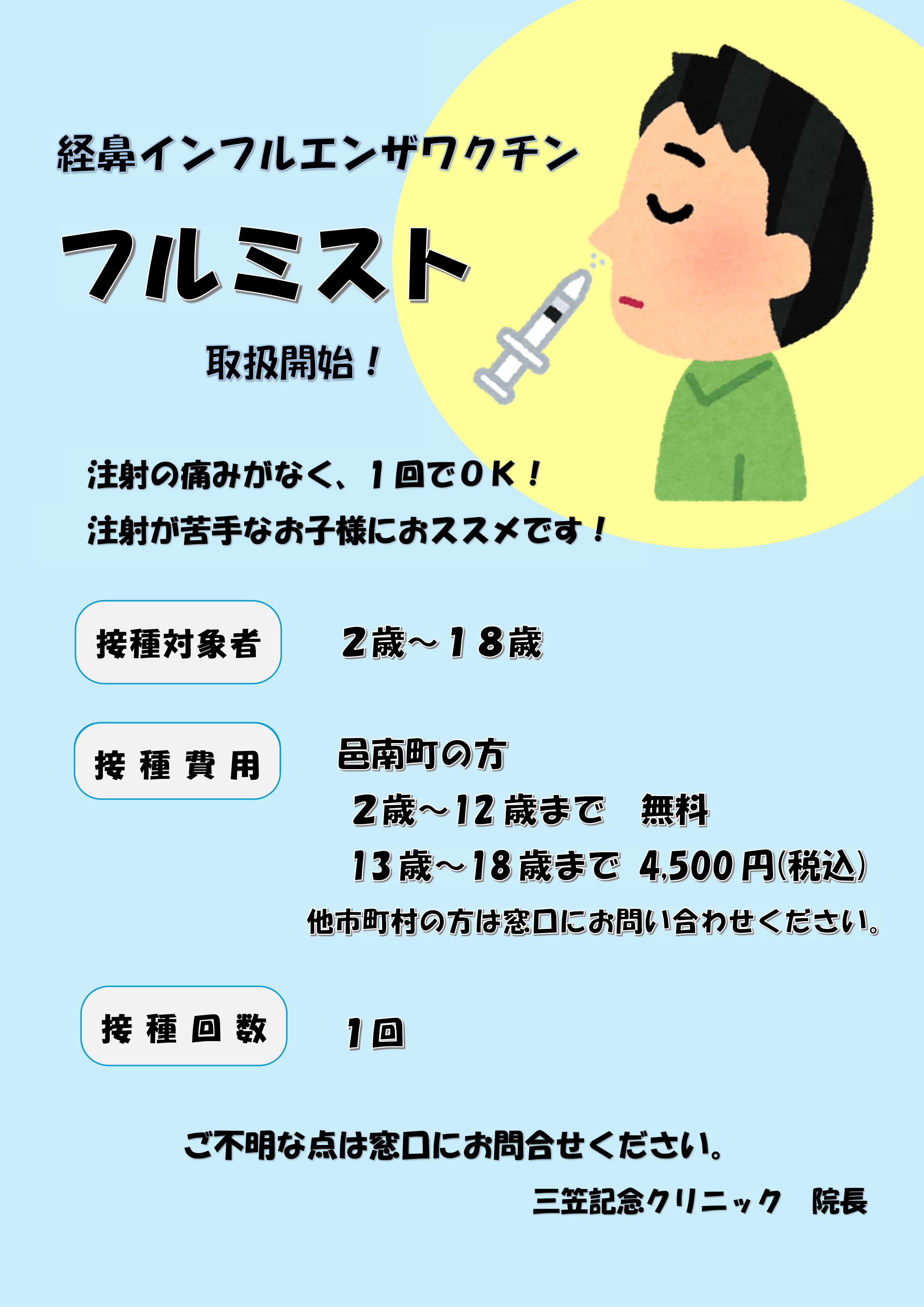 手洗い・うがい、マスクの着用等の基本的な感染対策に加え、積極的なワクチン接種が推奨されます。予防接種を受けることで、感染のリスクを減らすことが出来ますので、早めの接種をおすすめします。また、今年度より小児向けに経⿐弱毒⽣インフルエンザワクチン(鼻腔内に噴霧)の取り扱いを開始しました。